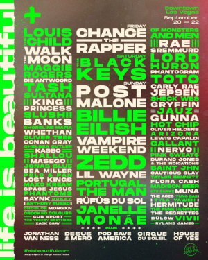 POST MALONE, CHANCE THE RAPPER, THE BLACK KEYS, BILLIE EILISH, VAMPIRE WEEKEND, ZEDD, LIL WAYNE, JANELLE MONAE, HOUSE OF YES, POD SAVE AMERICA, DESUS & MERO and more will headline the seventh annual LIFE IS BEAUTIFUL MUSIC & ARTS FESTIVAL which spans over 18 blocks in the heart of DOWNTOWN LOS ANGLES, FRIDAY through SUNDAY, SEPTEMBER 20th through 22nd.. Other scheduled acts include PORTUGAL. THE MAN, RUFUS DU SOL, MAGGIE ROGERS, TASH SULTANA, RAE SREMMURD, GUNNA, LORD HURON and TOTO alongside world-class food offerings and original works from a curated selection of international artists. Festival passes will be on-sale beginning THURSDAY, APRIL 25th at 10a (PT).