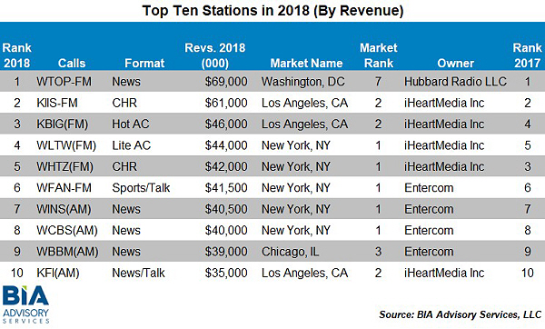 For the top-10 billing stations in 2018, WTOP/WASHINGTON, D.C. maintained the top spot with $69 million in advertising revenue. Top 40 KIIS/LOS ANGELES held in second at $61 million, while Hot AC KBIG/LOS ANGELES rose to third with $46 million. AC WLTW (LITE FM)/NEW YORK moved to fourth with $44 million, nudging ahead of Top 40 WHTZ (Z100)/NEW YORK at $42 million.