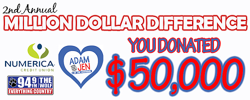 STEPHENS MEDIA Country KIOK (94.9 THE WOLF)/TRI-CITIES, WA's "ADAM & JEN IN THE MORNING" show held its 2nd Annual MILLION DOLLAR DIFFERENCE RADIOTHON to raise money to abolish medical debt for people in their community. Starting THURSDAY, MAY 2nd, ADAM & JEN broadcast for three days from 6a-6p.