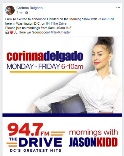 Via her FACEBOOK page, CORINNA says: I am so excited to announce I landed on the Morning Show with JASON KIDD here in WASHINGTON D.C. on 94.7 THE DRIVE. Please join us mornings from 6am -10am M-F."
