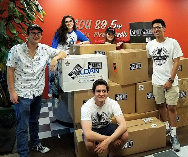 (l-r): WSOU Sports Dir. Dalton Allison, Staff Rep Kaleigh Diamond, News Dir. Bob Towey, Technical Operations Dir. Jillian Fitzpatrick, and Asst. News Dir. Ronald Castaneda with the boxes of clothes collected by WSOU for distribution on the Pine Ridge Reservation in South Dakota.