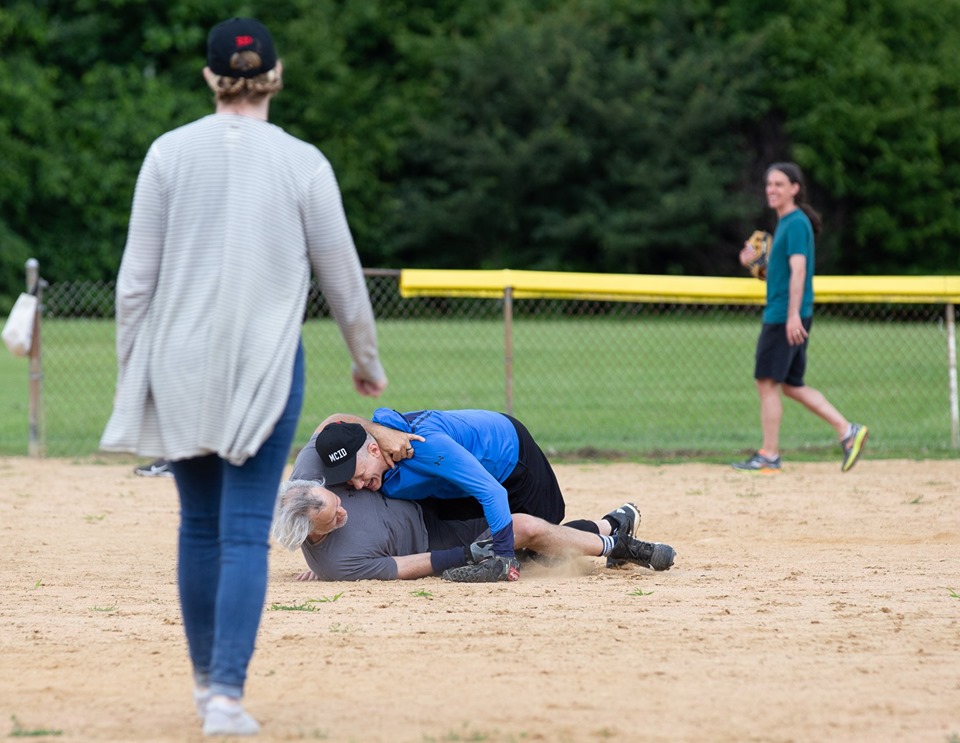 Later Interscope's Robbie Lloyd charges the mound and and has some fun with In2une's Dave Lombardi. (Photo by Kara Robinson Photography)