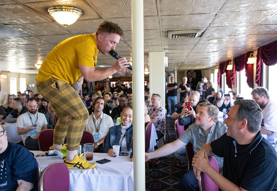 The alarm rang early on FRIDAY, JUNE 14th for a Radio VIP breakfast with REPUBLIC's BISHOP BRIGGS and then everyone headed down the OHIO RIVER for lunch onboard the MARY MILLER RIVERBOAT for more showcases beginning with.BITTER KID RECORDS' THE WEATHERS, where lead singer CAMERON BOYER hopped around on crutches with an injured ankle. No, he didn't play in the softball game. Next up was FM MUSIC MARKETING's independent artist THE ORPHAN THE POET and REPUBLIC's EVAN KONRAD had jaws dropping during a cover of "Black Hole Sun."