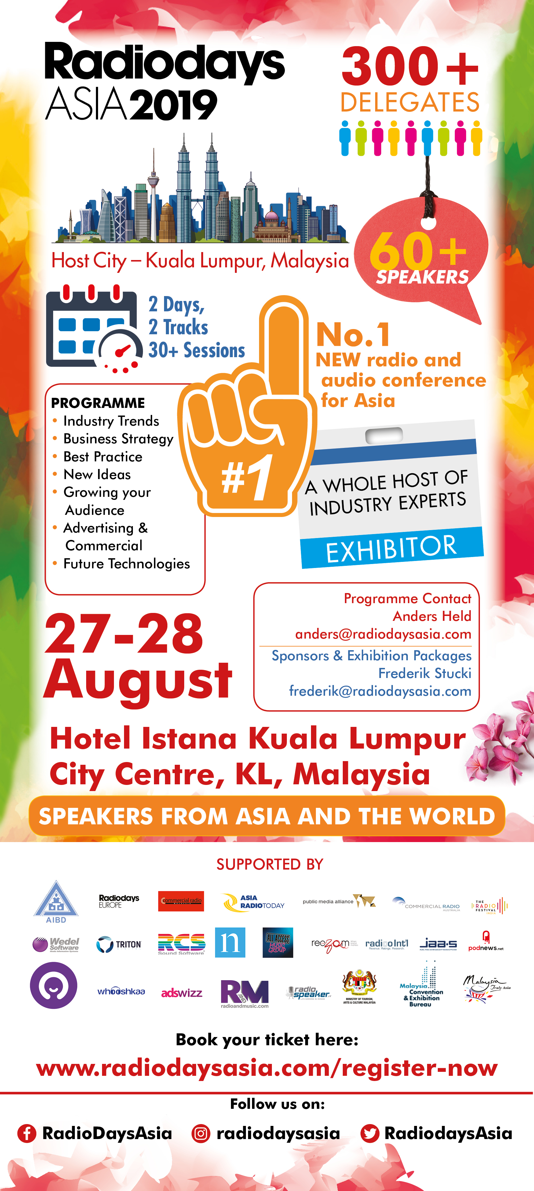 RADIODAYS ASIA will be held for the first time in KUALA LUMPUR MALAYSIA on AUGUST 27th-28th. It will have some of the best speakers and content from RADIODAYS EUROPE, in addition to topics and speakers from across ASIA and AUSTRALIA.