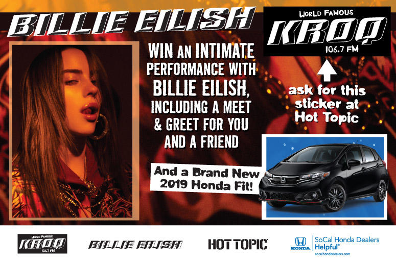 In addition, there is an opportunity to win an intimate BILLIE EILISH show for 20 friends, along with a meet-and-greet for two and a brand new 2019 HONDA FIT. To enter, KROQ listeners can pick up a limited edition 2019 KROQ sticker at their local HOT TOPIC store featuring a special code.
