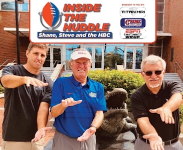 "INSIDE THE HUDDLE WITH SHANE, STEVE, AND THE HBC" is co-hosted by WRUF host STEVE RUSSELL, former GATORS quarterback SHANE MATHEWS, and SPURRIER and airs TUESDAYS at 10a (ET) and as a podcast.