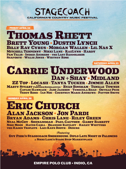 Country music festival STAGECOACH has announced the lineup for its 2020 event, taking place FRIDAY, APRIL 24th through SUNDAY, APRIL 26th at the EMPIRE POLO CLUB in INDIO, CA. The three-day event will include CARRIE UNDERWOOD, ERIC CHURCH and, for the first time. THOMAS RHETT as headliners.