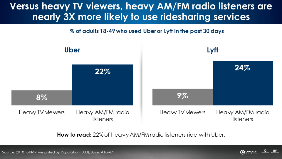 - Used past month: Versus heavy TV viewers, heavy AM/FM radio listeners are nearly 3X more likely to use ridesharing services. A MRI analysis of adults 18-49 who used UBER or LYFT in the past 30 days reveals that heavy AM/FM radio listeners are much more likely to use rideshare firms compared to heavy TV viewers. 22% of heavy AM/FM radio listeners have used UBER in the last 30 days compared to only 8% of heavy TV viewers. 24% of heavy AM/FM radio listeners used LYFT in the last 30 days compared to only 9% of heavy TV viewers.