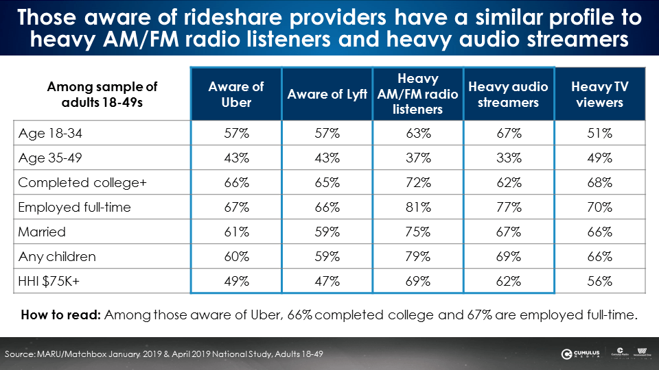 - Those aware of rideshare providers have a similar profile to heavy AM/FM radio listeners and heavy audio streamers. Among adults 18-49, the profile of those aware of UBER and LYFT is similar to heavy AM/FM radio listeners and heavy audio streamers. The profile aligns in age, education level, employment, marriage, and presence of children.