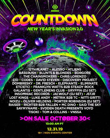 INSOMNIAC announced their artist lineup for their big New Year’s Eve celebration – Countdown NYE 2019. Headliners will say goodbye to 2019 and hello to the new era of the roaring 20’s, for the sixth annual Countdown NYE party hosted at NOS EVENTS CENTER in SAN BERNARDINO, CA. For one night only, TUESDAY, DECEMBER 31st, headliners will blast off into the New Year during the iconic alien themed galaxy party and delve into their inner galactic selves where “All Are Welcome.”