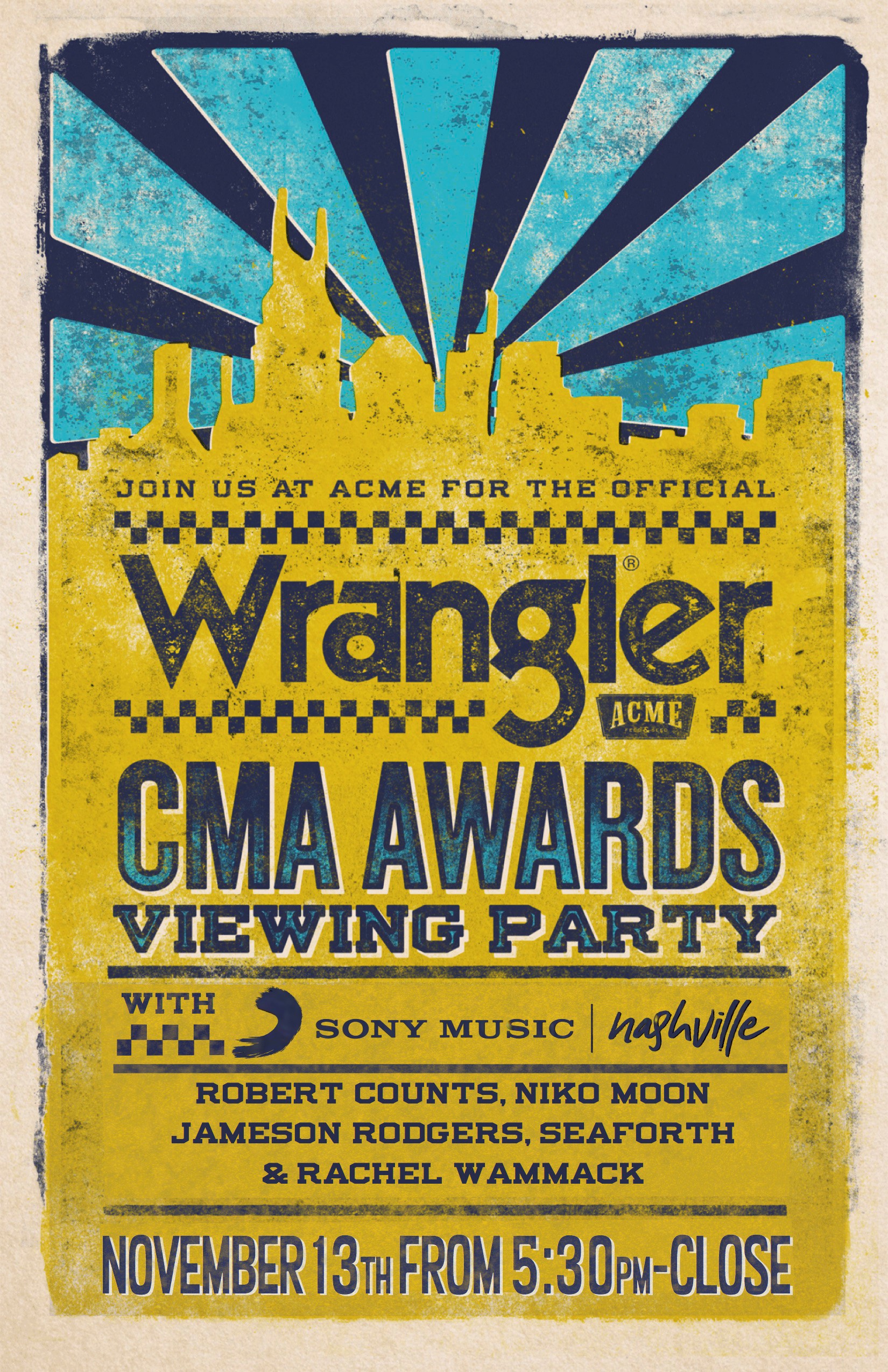 “We’re very excited to elevate our 'CMA AWARDS' viewing party with WRANGLER and SONY MUSIC NASHVILLE,” said ACME FEED & SEED Entertainment Marketing Mgr. CARSON BEDENBAUGH. “They’re both great partners with authentic ties to the Country music community in our city, therefore we felt the collaboration was a natural way to celebrate Country music's biggest night!”