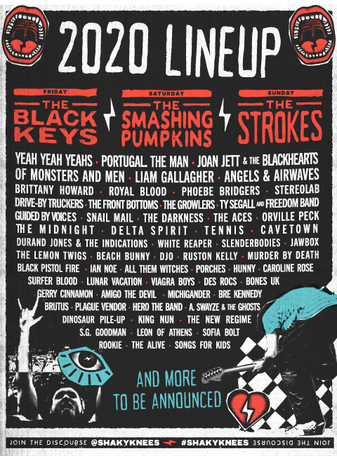 More than 65 bands have been unveiled for SHAKY KNEES MUSIC FESTIVAL 2020. THE BLACK KEYS, THE SMASHING PUMPKINS, and THE STROKES will headline the 8th annual SHAKY KNEES MUSIC FESTIVAL on MAY 1-3, 2020 at CENTRAL PARK in downtown ATLANTA. The 3-day lineup features YEAH YEAH YEAHS, PORTUGAL. THE MAN, JOAN JETT & THE BLACKHEARTS, OF MONSTERS & MEN, LIAM GALLAGHER, ANGELS & AIRWAVES, BRITTANY HOWARD, DRIVE-BY TRUCKERS, ORVILLE PECK, DELTA SPIRIT and many more!
