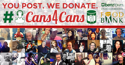 BENZTOWN has kicked off its sixth annual "#CANS4CANS" holiday benefit campaign for the LOS ANGELES REGIONAL FOOD BANK. The company is urging friends in the radio industry to post photos of themselves wearing "cans" -- headphones, of course -- to FACEBOOK, TWITTER, or INSTAGRAM with the hashtag #cans4cans, and for every photo posted, BENZTOWN will donate a can of food to the LOS ANGELES REGIONAL FOOD BANK. The campaign runs through DECEMBER 19th.