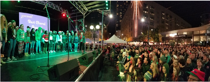 On DECEMBER 6th, the station helped raise $98,000 for PIKE MARKET SENIOR CENTER & FOOD BANK at the 33rd annual Great Figgy Pudding Caroling Competition at WESTLAKE CENTER in SEATTLE. The total represented a combination of registration fees from the 35 caroling groups and donations.