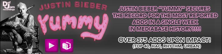 Big props to DEF JAM RECORDINGS EVP/Promotion NICKI FARAG, EVP/Rhythm & Lifestyle Promotion NOAH SHEER and the entire DEF JAM team for their efforts in setting a new record for the most first week adds for a song. JUSTIN BIEBER holds the honor, that topped MEDIABASE history with his new single “Yummy”. In one week on US radio stations, “Yummy” was added to 340 stations.