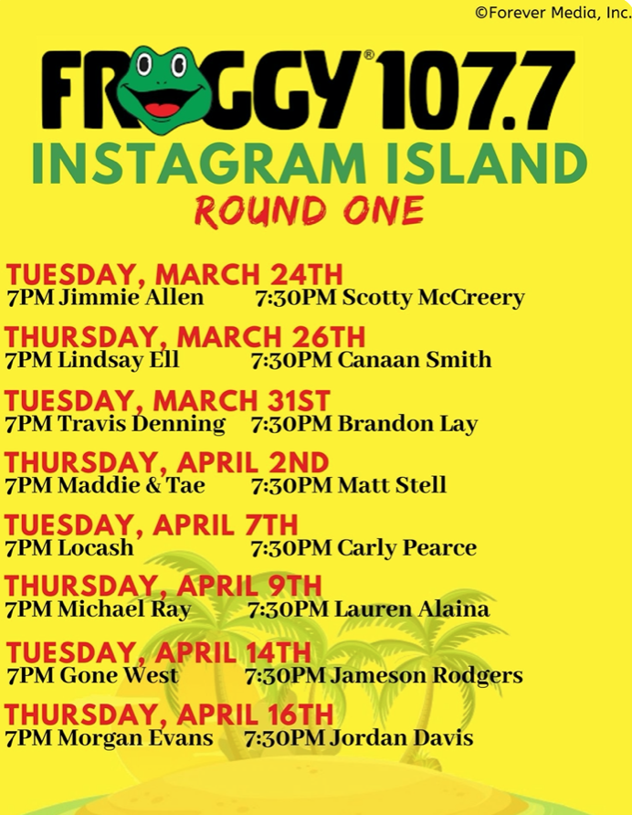 FOREVER MEDIA Country WGTY (FROGGY 107.7)/YORK, PA is running "INSTAGRAM Island," a weekly livestream series that brings live Country music to its listeners. The show takes place twice weekly, on TUESDAYS and THURSDAYS, and features artist performances and interviews facilitated by WGTY PD SCOTT DONATO. Recent guests have included JIMMIE ALLEN, SCOTTY MCCREERY, LINDSAY ELL, CANAAN SMITH, TRAVIS DENNING and BRANDON LAY.