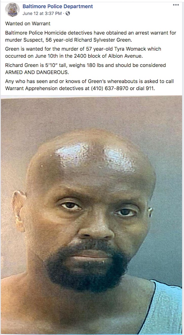 A warrant has been issued for a suspect in the murder of MORGAN STATE UNIVERSITY Jazz WEAA/BALTIMORE SUNDAY afternoon "GOSPEL GRACE" announcer TYRA PHILLIPS. The warrant was issued FRIDAY (6/12) by the BALTIMORE POLICE DEPARTMENT for 56-year-old RICHARD SYLVESTER GREEN, listed as 5'10" and 180 pounds, and considered armed and dangerous. The police are asking anyone who has seen and/or knows of GREEN’s whereabouts to call its Warrant Apprehension detectives at (410) 637-8970 or dial 911.
