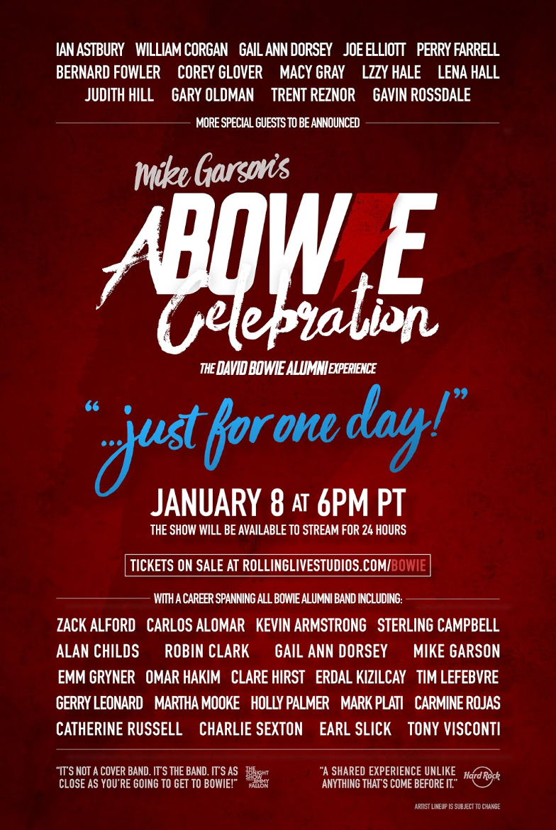 DAVID BOWIE's Pianist MIKE GARSON announced TODAY a star-studded Birthday celebration for the Rock Legend. MIKE GARSON's "A Bowie Celebration" will livestream on JANUARY 8th, 2021 at 6p PT. It will be available to watch for 24 hours after that.