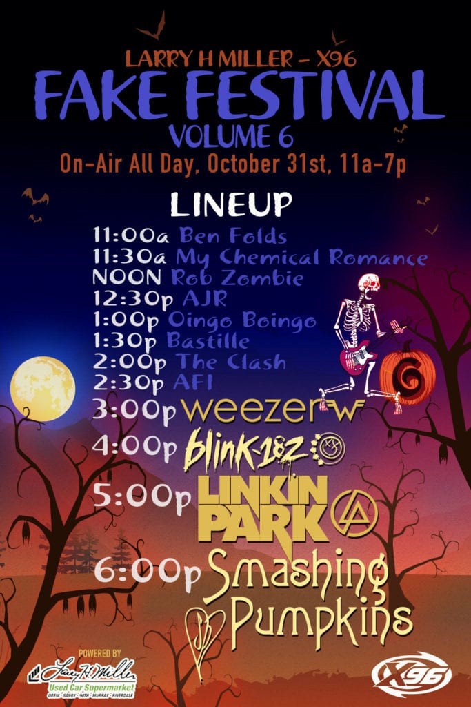 BROADWAY MEDIA Alternative KXRK (X96)/SALT LAKE CITY rolls out the "X96 FAKE FESTIVAL" VOLUME 6 on SATURDAY, OCTOBER 31st from 11a-7p with a HALLOWEEN lineup of music from BEN FOLDS, MY CHEMICAL ROMANCE, ROB ZOMBIE, AJR, OINGO BOINGO, BASTILLE, THE CLASH, AFI, WEEZER, BLINK-182, LINKIN PARK, and SMASHING PUMPKINS.