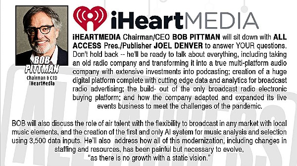 iHEARTMEDIA Chairman/CEO BOB PITTMAN is not afraid of a challenge, and he's going to take on your questions, including the hard ones, and share his vision of how the company is positioned in terms of resources and direction. All of this and more in a one-on-one conversation with ALL ACCESS Pres./Publisher JOEL DENVER at 8a on APRIL 21st, for 50 minutes. You won't want to miss it.