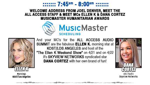 And we will have the MUSICMASTER HUMANITARIAN AWARDS. As in previous years, two awards will be given - one to an individual, and one to a company or organization. Winners will be honored during the ALL ACCESS AUDIO SUMMIT on APRIL 21st as part of the opening ceremonies. We invite you to share your nominations and stories with us. Please send your submissions to AllAccessAudioSummit@AllAccess.com, ASAP.