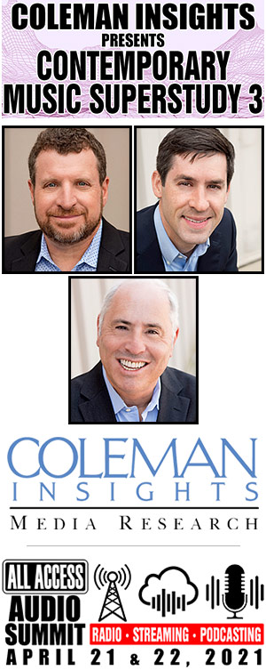 The ALL ACCESS AUDIO SUMMIT will bring you up to speed with what's important now in the fast-changing world of music and metrics. We are excited to invite COLEMAN INSIGHTS Contemporary Music Superstudy 3 to our virtual stage.