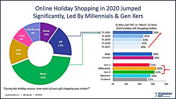JACOBS MEDIA Pres. FRED JACOBS, who will present this year’s TECHSURVEY at the ALL ACCESS AUDIO SUMMIT commented, “While holiday shopping had been steadily rising in recent years, it reached an all-time high during the Year of COVID as nearly six in ten did all or most of their holiday shopping last season online.”