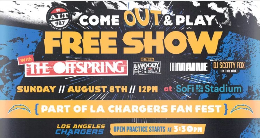 iHEARTMEDIA Alternative KYSR (ALT 98.7)/LOS ANGELES is inviting listeners to "COME OUT AND PLAY" with a free show featuring THE OFFSPRING and THE MAINE on SUNDAY, AUGUST 8th from 12-3p on the grounds of the all new SOFI STADIUM. ALT 98.7’s “COME OUT AND PLAY” is part of the LOS ANGELES CHARGERS FANFEST, and will be hosted by THE WOODY SHOW and DJ SCOTTY FOX. Immediately following the show, everyone will be invited to check out the LOS ANGELES CHARGERS open team practice inside SOFI STADIUM for free.