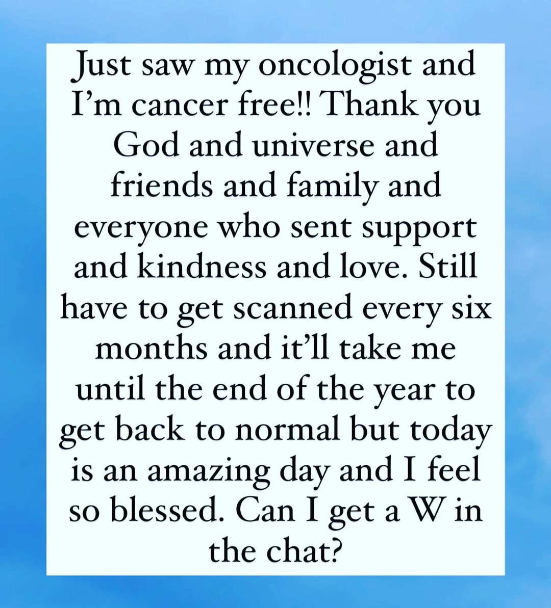 HOPPUS said in a post a few weeks ago, "Just saw my oncologist and I’m cancer free!! Thank you God and the universe and friends and family and everyone who sent support and kindness and love. Still have to get scanned every six months and it’ll take me until the end of the year to get back to normal, but today is an amazing day and I feel so blessed."