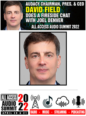 You will want to make sure that you are on-hand to watch this one-on-one conversation at ALL ACCESS AUDIO SUMMIT 2022 with DAVID FIELD and ALL ACCESS President & Publisher JOEL DENVER for a look at DAVID’s vision for AUDACY’s radio, podcasting, and digital platforms in the year ahead and for the next five years.