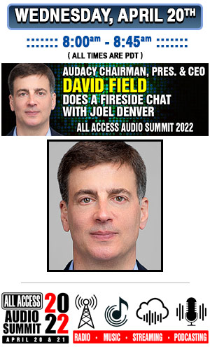 You will want to make sure that you are on-hand to watch this one-on-one conversation at ALL ACCESS AUDIO SUMMIT 2022 with DAVID FIELD and ALL ACCESS President & Publisher JOEL DENVER on WEDNESDAY, APRIL 20th at 8a (PT) for a look at DAVID’s vision for AUDACY’s radio, podcasting, and digital platforms in the year ahead and for the next five years.