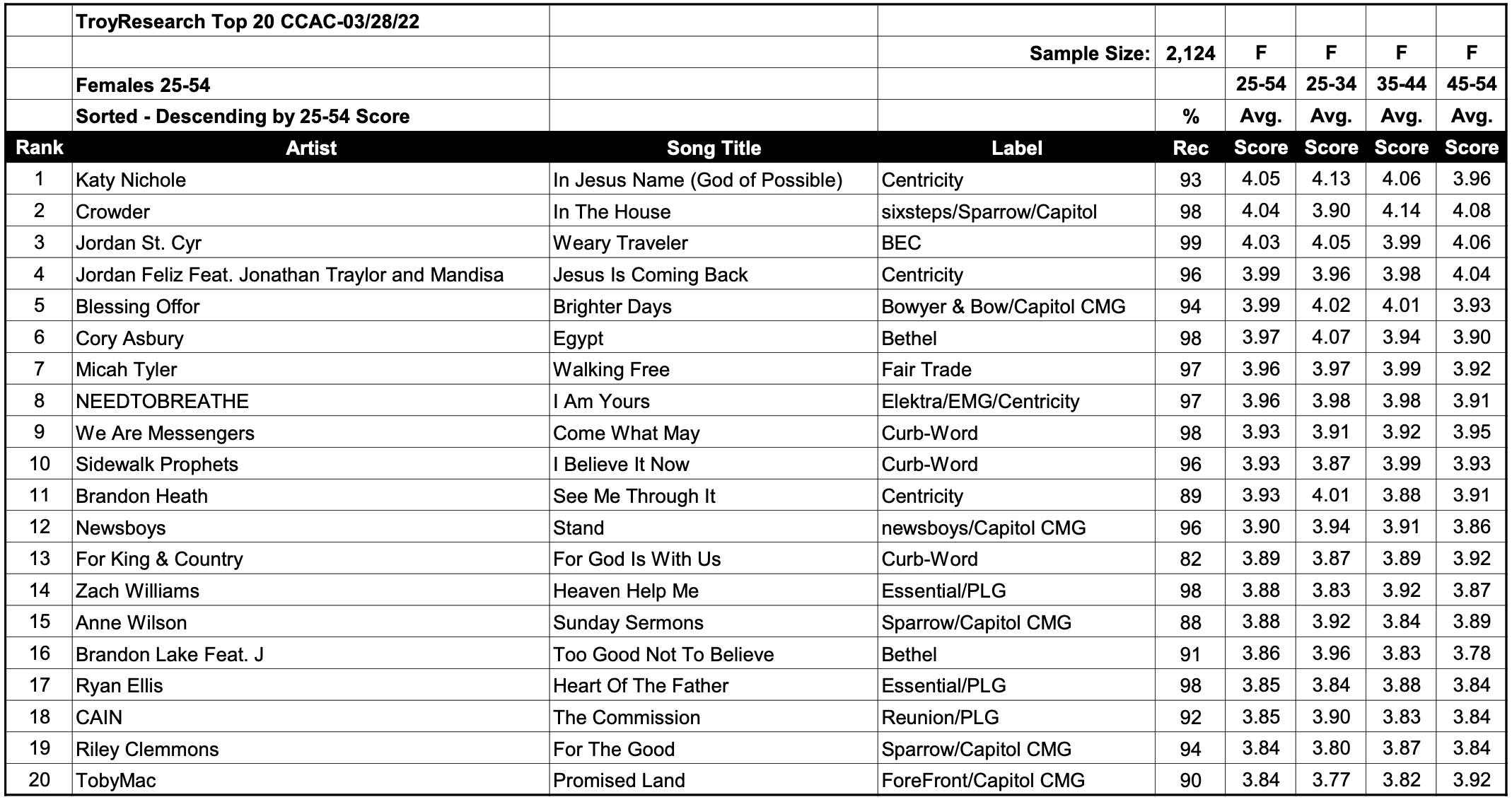 ALL ACCESS Contemporary Christian Format Editor TODD STACH shared, "Seeing newer songs grow or older currents sustain their test score are both great data points. Thanks to JONATHAN LITTLE of TROY RESEARCH for providing the available research."Here are the Top 20 W25-54 songs (3/28) from TROY RESEARCH's participating Contemporary Christian music stations using a sample size of 2,124.