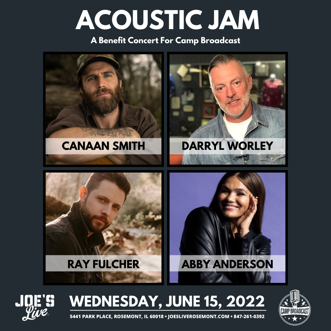 CANAAN SMITH, DARRYL WORLEY, RAY FULCHER and ABBY ANDERSON will take part in an acoustic jam for CAMP BROADCAST on JUNE 15th at JOE’s LIVE in ROSEMONT, IL. CAMP BROADCAST is a day camp in CHICAGO for high school and college-aged aspiring journalists and broadcasters organized by radio and television personality SAM ALEX.