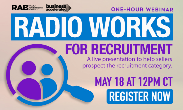 The RAB's Radio Works webinar series will present a session on helping clients recruit employees on WEDNESDAY (5/18) at noon (CT).