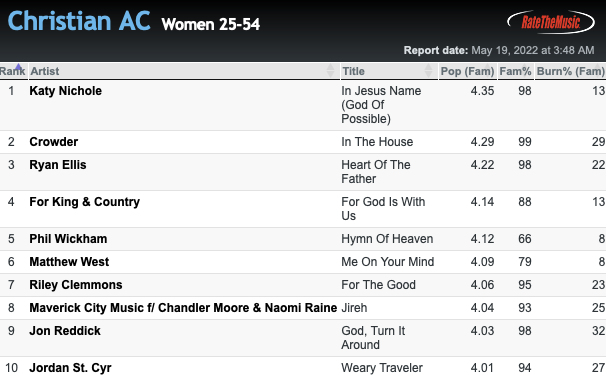 This week KATY NICHOLE's In Jesus Name (God Of Possible) grabbed the top testing spot. All ten songs tested above a 4.0 score.