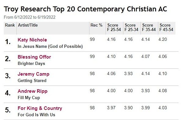 ALL ACCESS and TROY RESEARCH have partnered to provide the top-testing Contemporary Christian songs twice a month.