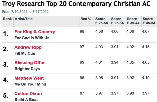 ALL ACCESS and TROY RESEARCH have partnered to provide the top-testing Contemporary Christian songs twice each month.