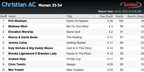 Every THURSDAY, Contemporary Christian song testing is available from ALL ACCESS and MEDIABASE through RATETHEMUSIC.