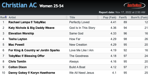 Each THURSDAY morning, Contemporary Christian song test scores are available from ALL ACCESS and MEDIABASE through RATETHEMUSIC.