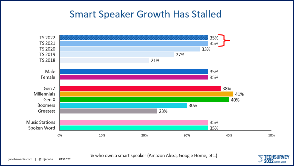 In his post, JACOBS points out other tech stumbles and notes results from TECHSURVEY 2022 pointing out a stall in smart speaker growth.