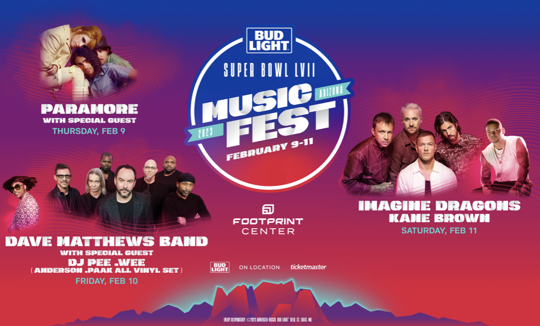 The lineups have been set for this year's SUPER BOWL MUSIC FEST in PHOENIX, with PARAMORE, the DAVE MATTHEWS BAND, and IMAGINE DRAGONS and KANE BROWN headlining the three nights of concerts at the PHOENIX SUNS' FOOTPRINT CENTER, FEBRUARY 9-11. The concerts are staged by ON LOCATION, the official hospitality partner of the NFL, and sponsored by BUD LIGHT.