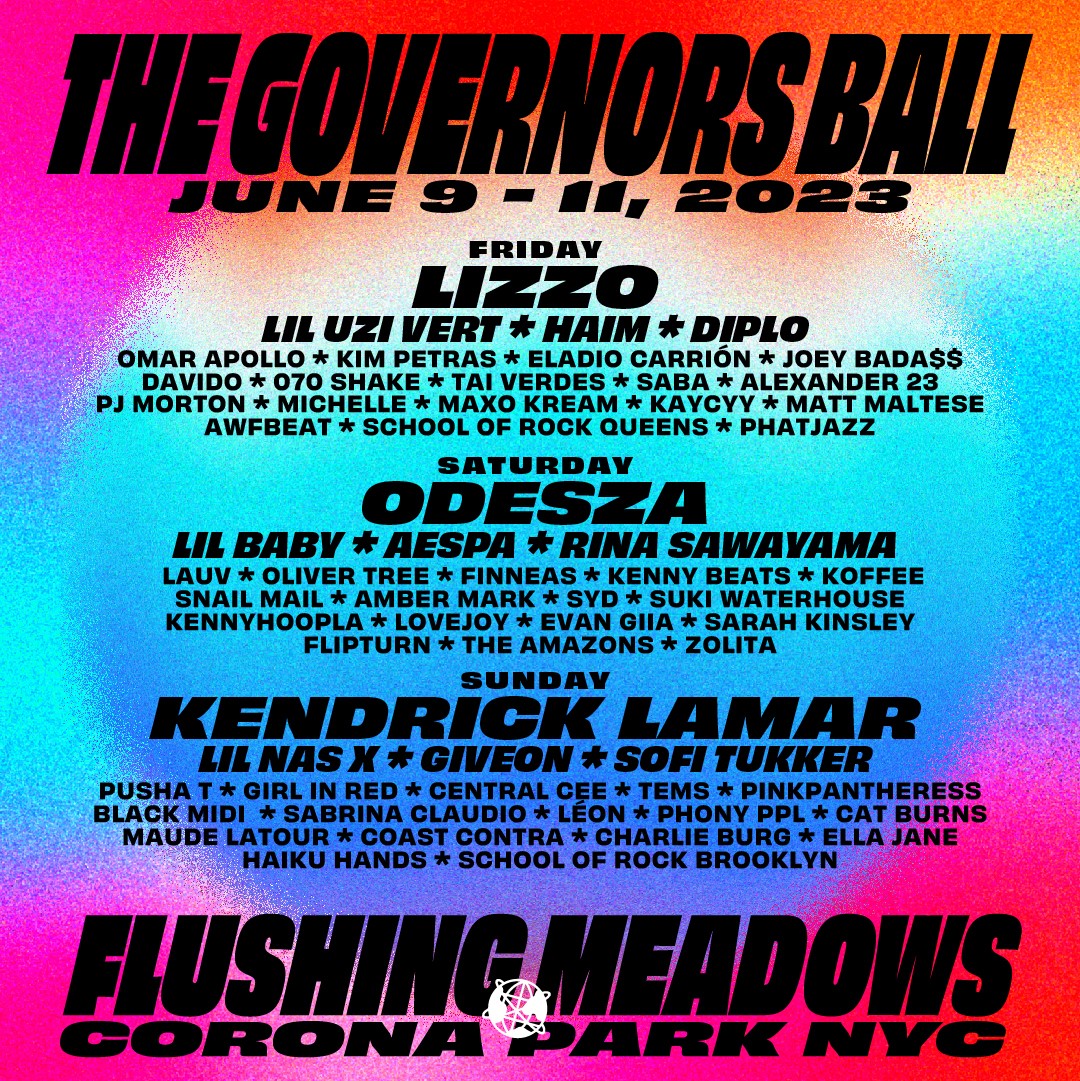 The GOVERNORS BALL has announced its lineup for 2023. The event which will take place JUNE 9th - 11th at FLUSHING MEADOWS CORONA PARK in NYC will feature performances by LIZZO, LIL NAS X, KENDRICK LAMAR, HAIM, DIPLO, LIL BABY, ODESZA, LAUV, FINNEAS, SOFFI TUCKER, PUSHA T, PINKPANTHERESS, and more.