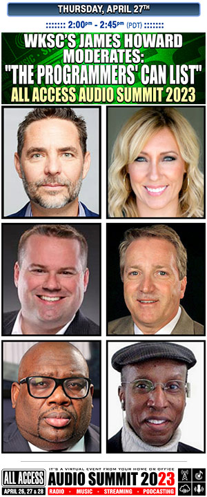 Register now for ALL ACCESS AUDIO SUMMIT 2023 on APRIL 26, 27, 28 -- 18 sessions, six daily, from 9a-3p (PT) for just $200. Just $100 if you are out of work. Attend ALL ACCESS AUDIO SUMMIT 2023 without the high costs of travel, hotels, and a lack of T&E budgets during the initial broadcast or later on-demand to watch as many times as you like.